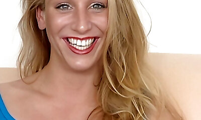 junge blondine freut sich auf das casting und faengt direkt an sich zu fingern