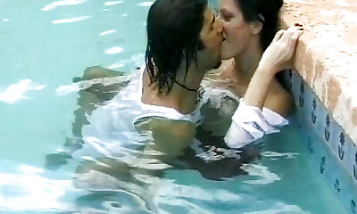 Skinny nymph at the pool nature is engaged in classic orgy...